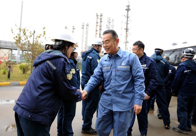 Zhang Xiguo and Li Ji visited the on-duty employees of Mechanical Department, T&P Department, Fuels-1 BT, Olefins BT, PO BT, Utilities BT, Shift Superintendent, Electrical Operation Group and Terminal BT, had a cordial talk with them and distributed holiday gifts. At each of their stop, the Company management waved to and shook hands with the employees, who stood up and applauded to welcome.