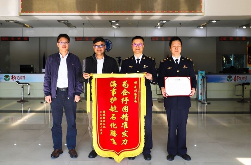 1211日,公司副总裁海森前往泉州海事局,向泉州市海事局副局长林武送上锦旗,对泉州海事局在公司轻裂解料产品合规海运出厂过程中给予的全方位支持与高效服务,致以最诚挚的谢意。